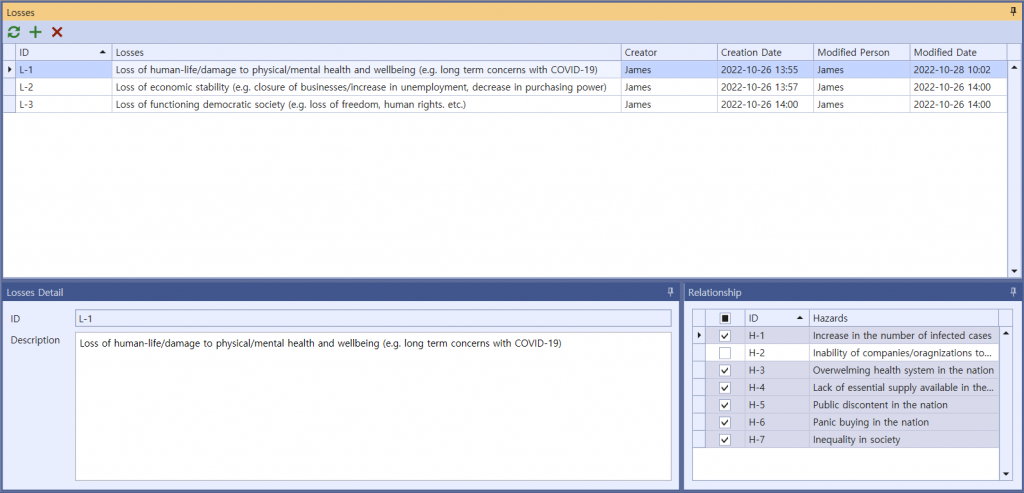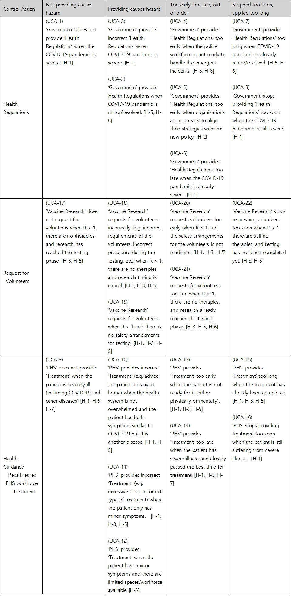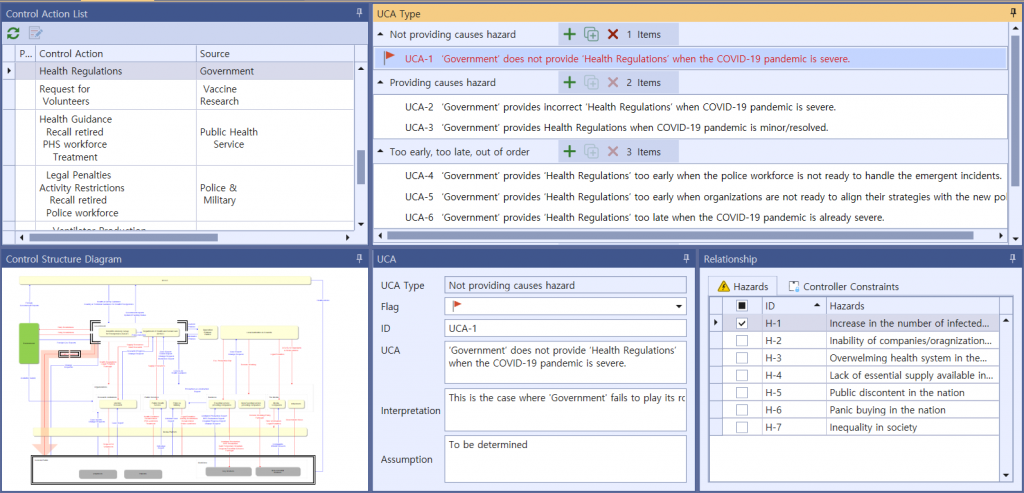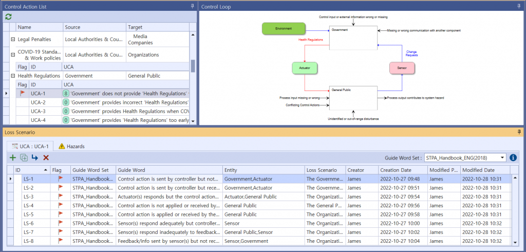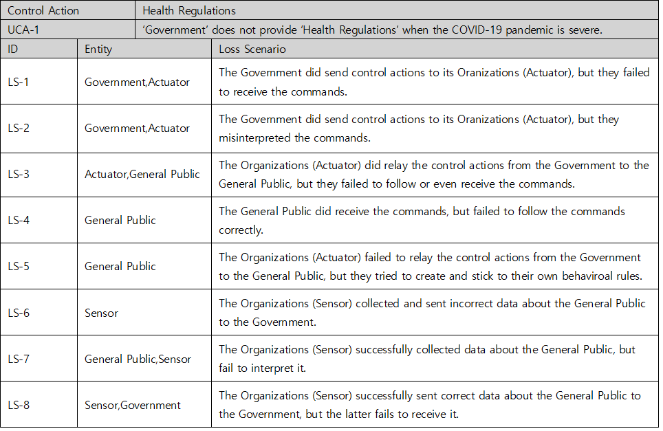 Once you have identified an UCA, you should create a scenario that causes it. STPA refers this as a Loss Scenario and can be written by referring to a Guide Word, etc. that causes a Loss Scenario provided by the Handbook. Below are some of the possible Loss Scenario in UCA1 :‘Government’ does not provide ‘Health Regulations’ when the COVID-19 pandemic is severe.