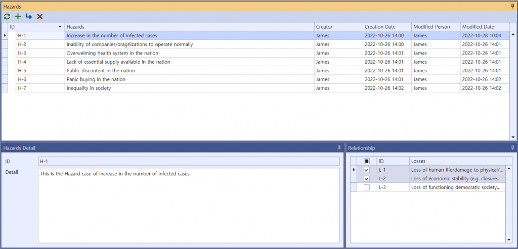 Seven Hazards can be identified for a system of National Responses, each of which then creates a traceable relationship with Losses. The identified hazards are as follows :