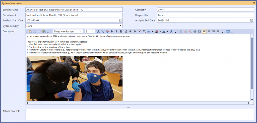 The target of this STPA analysis is National Responses to COVID-19 Pandemic. The following picture is the system information screen where the abstract for the analysis will be described in general.